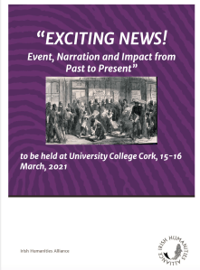 The Irish Humanities Alliance (IHA), in collaboration with University College Cork, presents- “EXCITING NEWS! Event, Narration and Impact from Past to Present,” bringing together a broad range of current research in Ireland and abroad, regarding an issue of crucial importance for the understanding of past cultures and our own. The conference is organised in collaboration with the EURONEWS project, an IRC-funded effort to trace the concept and use of news back to the early modern origins, as Ireland became integrated within a European network of shared experiences. The conference will take place on 15-16 March 2021 (either virtually or socially distanced subject to government Covid-19 advice and regulations at that time).
